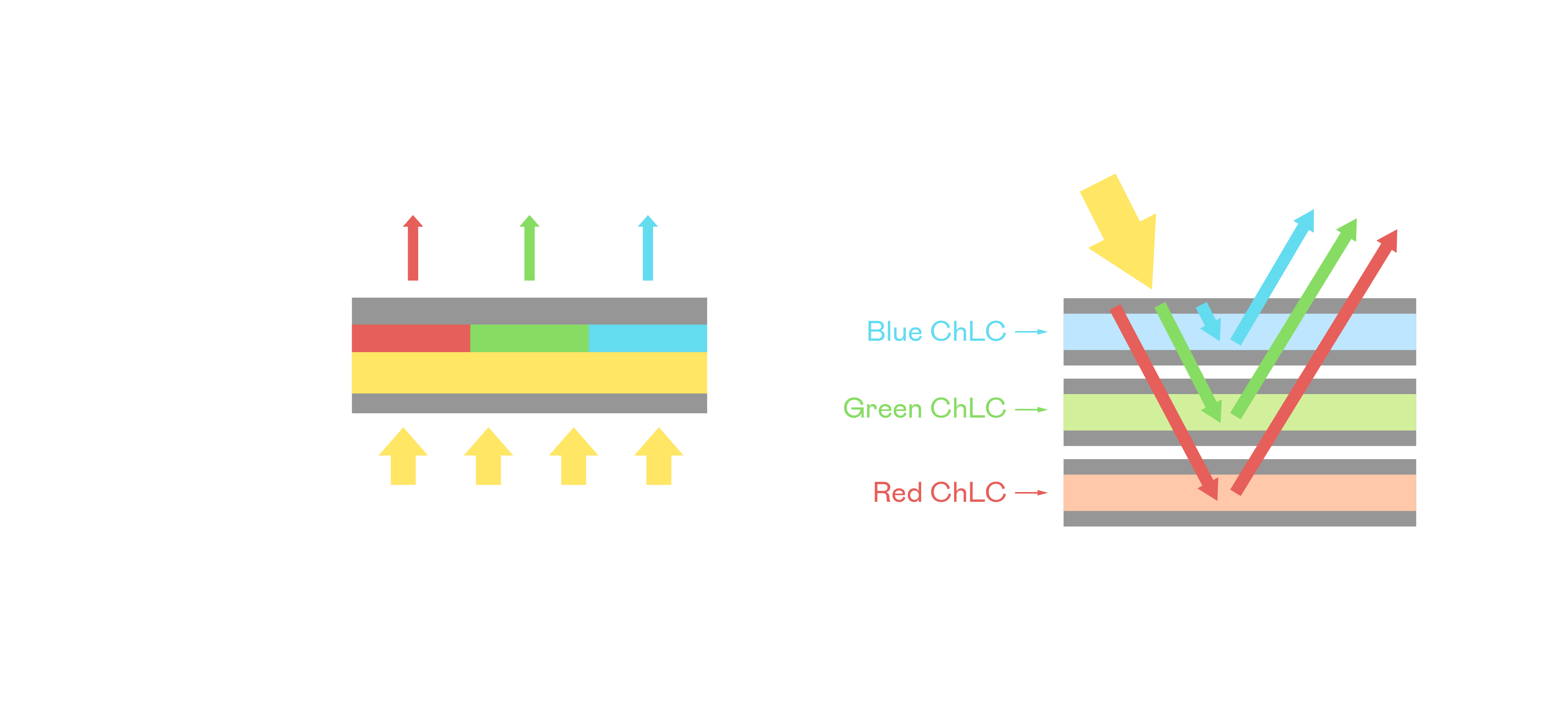 BC贷胆固醇液晶显示器是由红、绿、蓝三层胆固醇液晶面板堆叠而成,并采用无彩色滤光片设计,减少环境光在反射过程中的损耗。